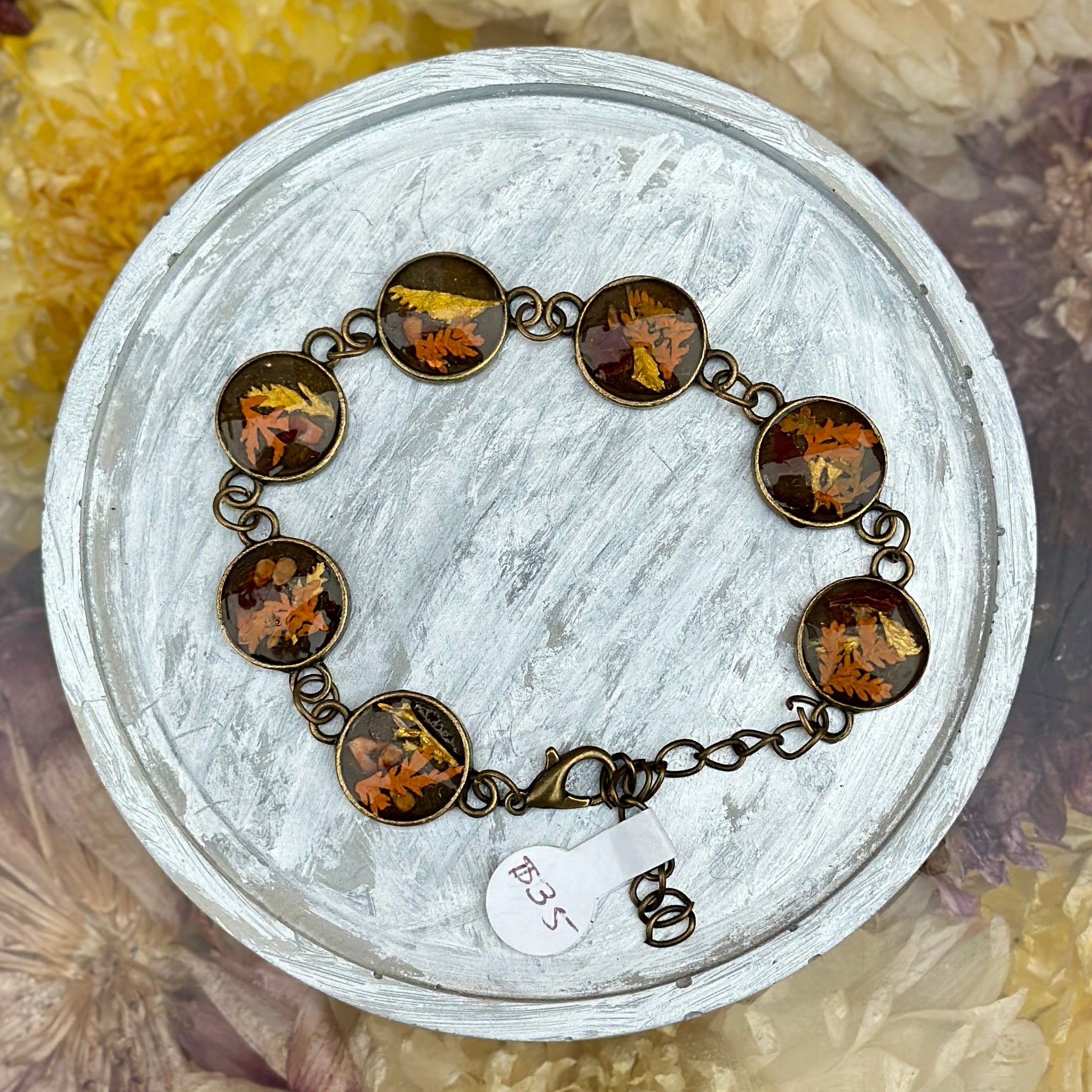 Delicate orange, red, and yellow botanical pieces encased in clear resin baubles, set in a bronze bracelet. Bracelet is approx. 8.5" long.