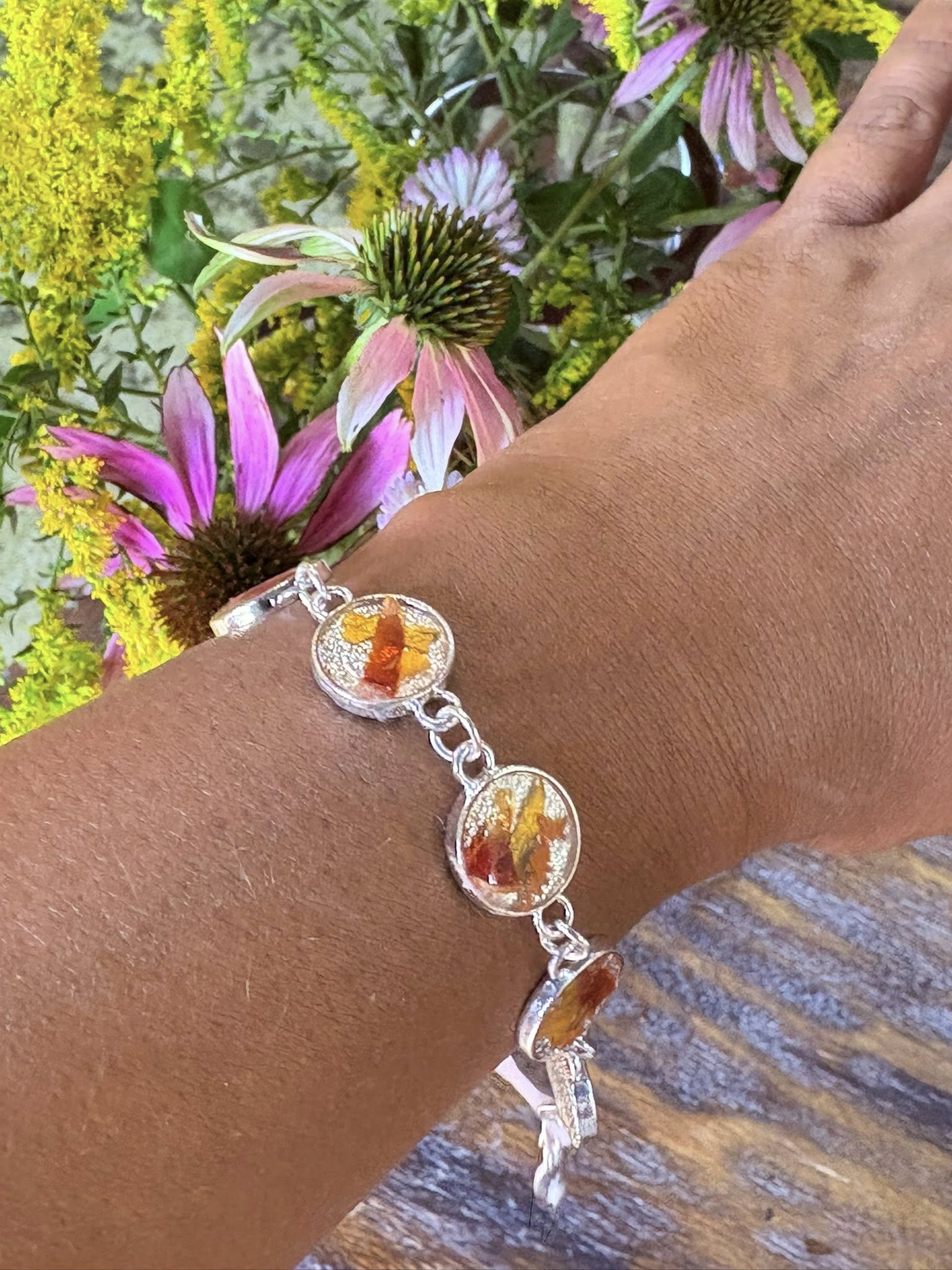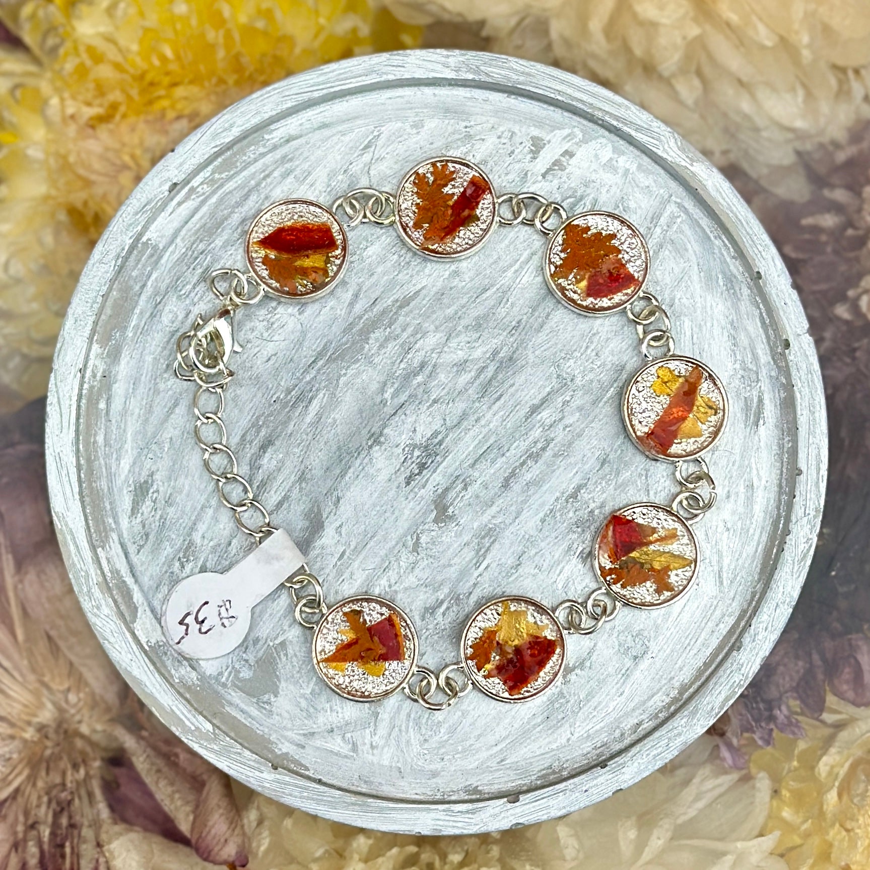 Tiny orange, red, and yellow botanical pieces encased in clear resin baubles, set in a silver bracelet.