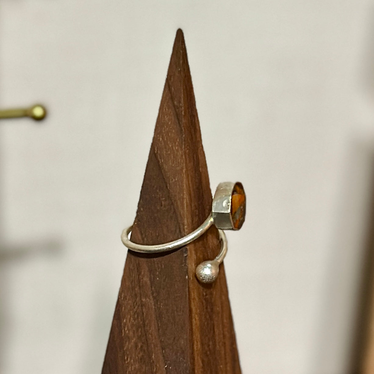 Delicate, autumn-inspired botanical pieces encased in clear resin and set in a small, spiral, silver setting. Size is adjustable.