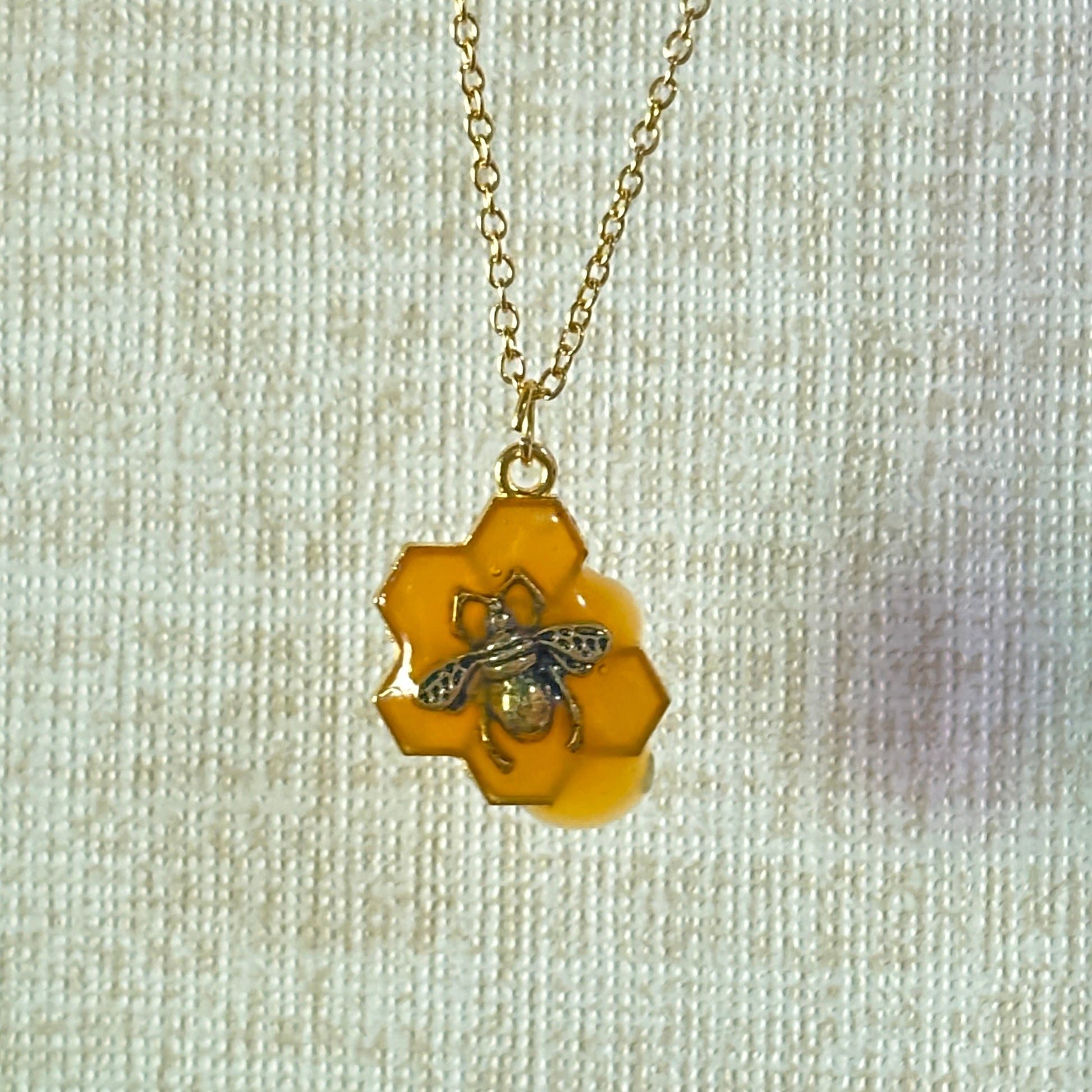 Dripping honeycomb necklace featuring small bee detail, peach tinted resin, and 6 hexagonal honeycombs.