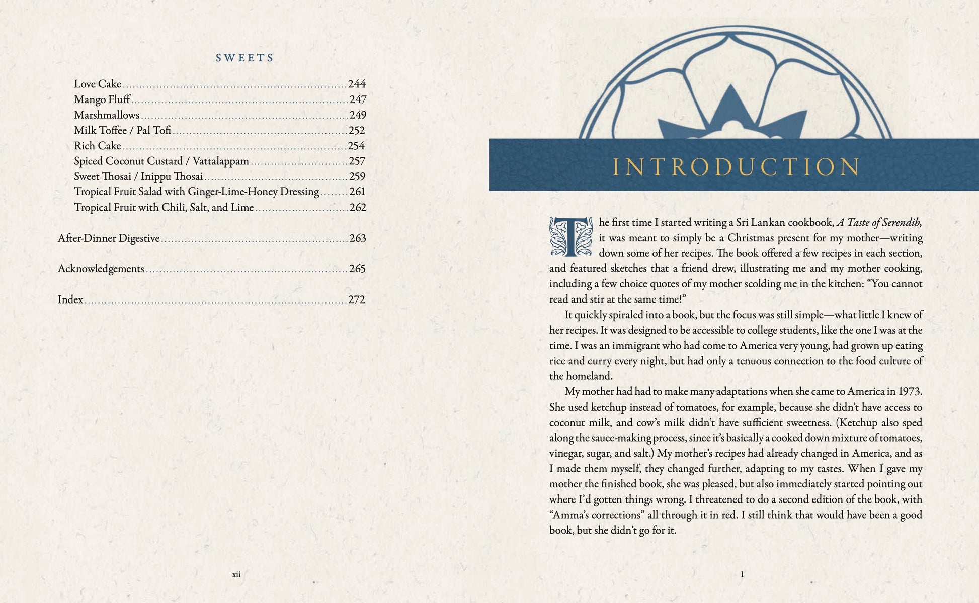 In A Feast of Serendib, novelist and post-colonial academic Mary Anne Mohanraj introduces her mother's cooking and her own American adaptations, providing an introduction to Sri Lankan American cooking that is straightforward enough for a beginner, yet nuanced enough to capture the unique flavors of Sri Lankan cooking.
