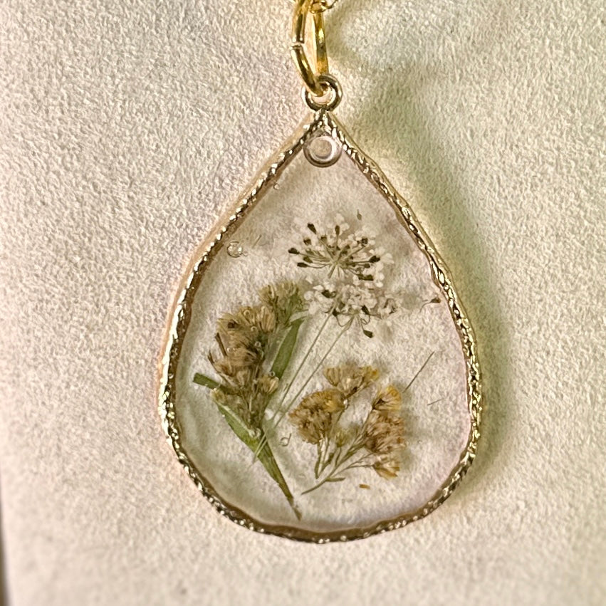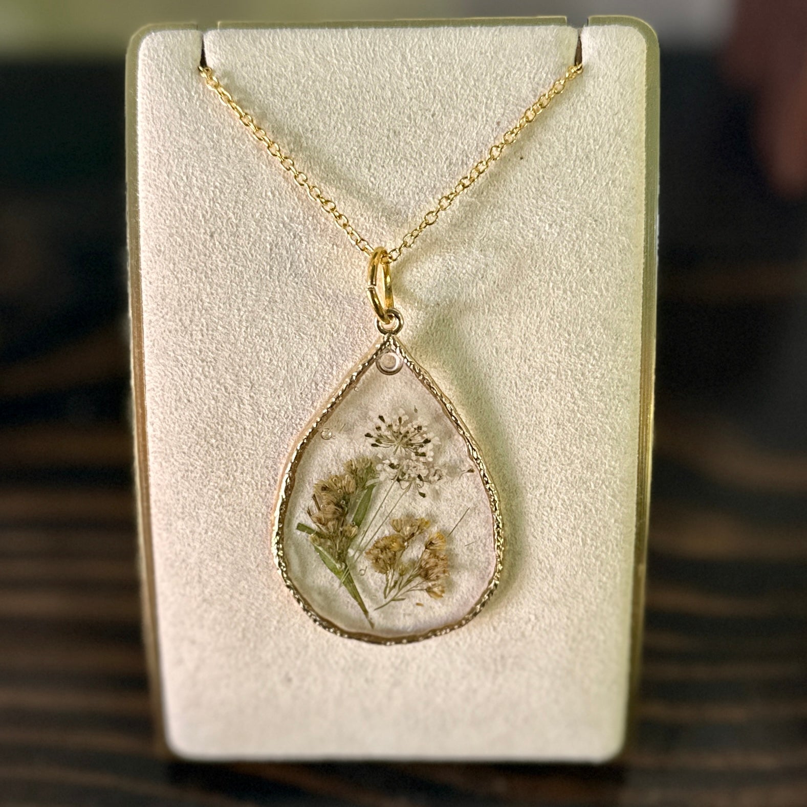 Delicate yellow and white botanical pieces encased in clear resin and set in a large, gold-framed, teardrop pendant. Necklace chain is 18" long with a claw clasp. Pendant is approx. 2" long.