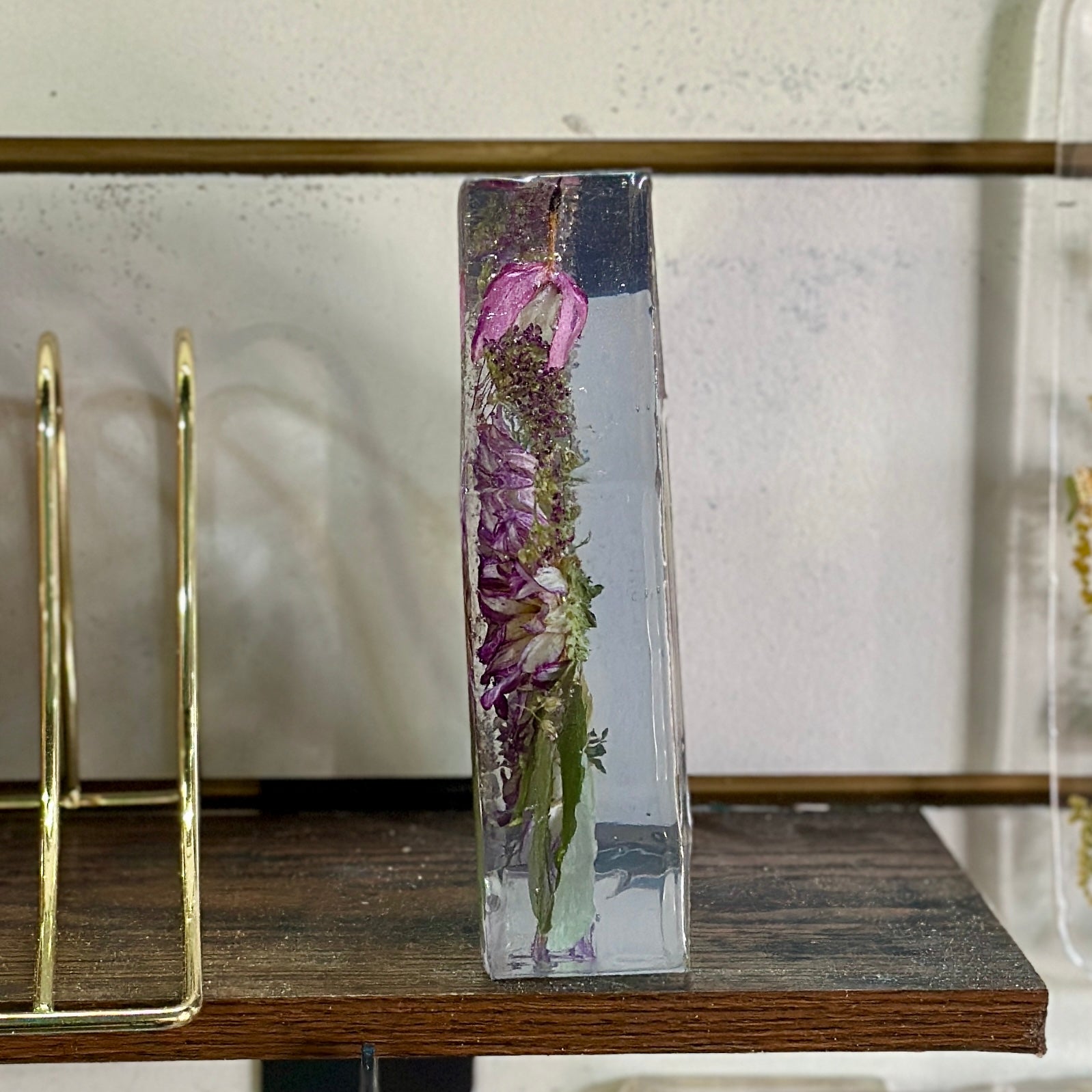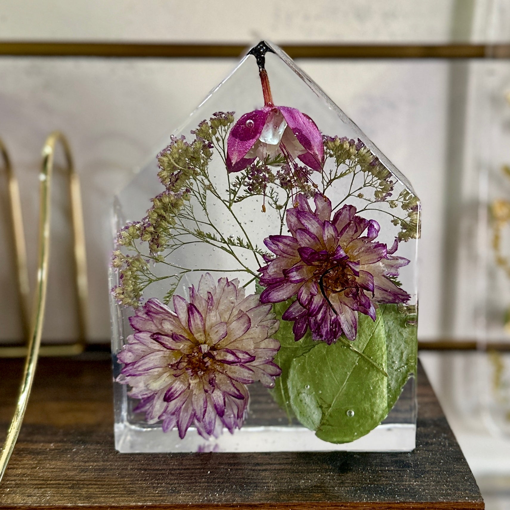 Hand-poured resin house made with dried mixed dahlias and leaf, set in clear resin. Smooth on the front, textured on the back. Approximately 4.5" wide x 6" tall x 1.5" deep.