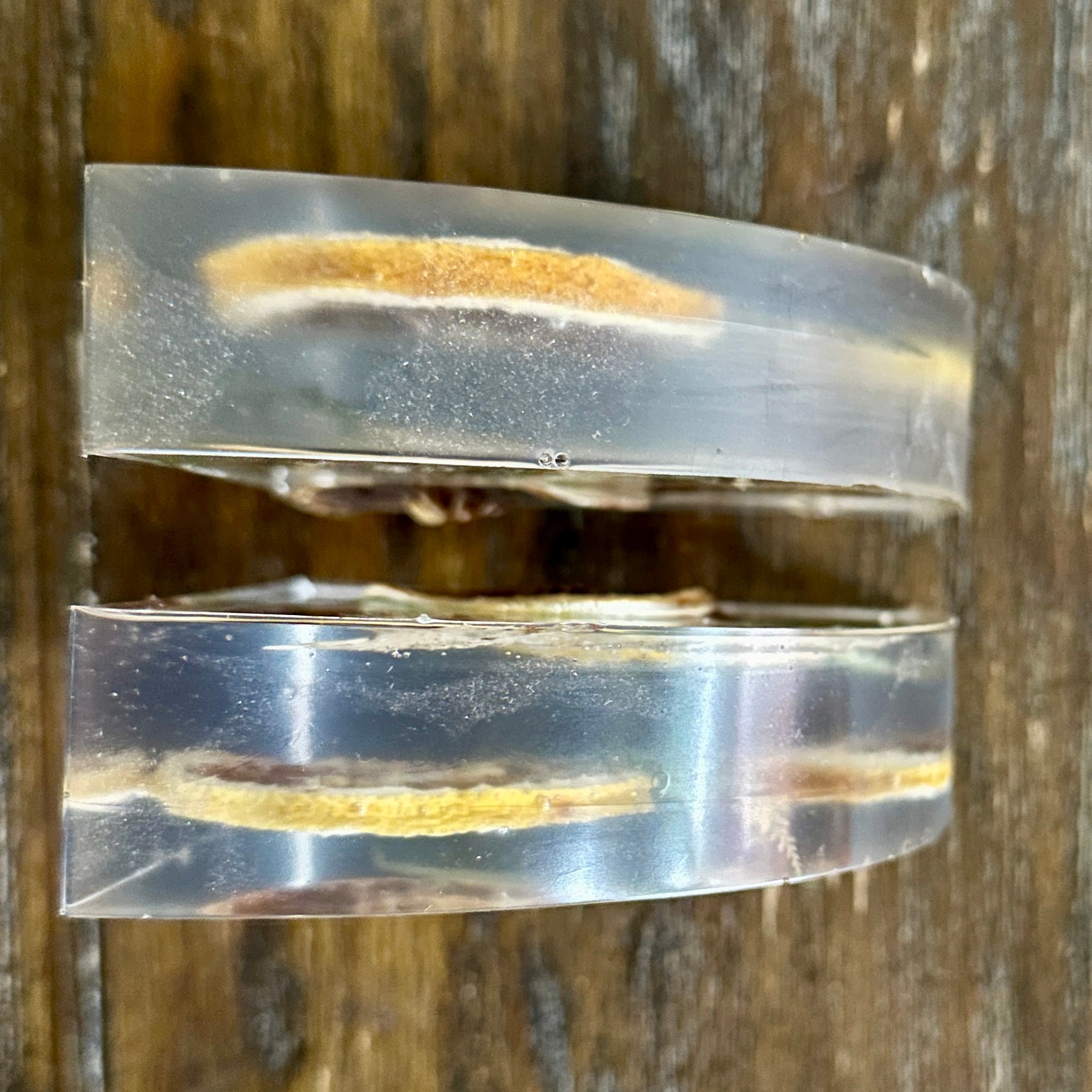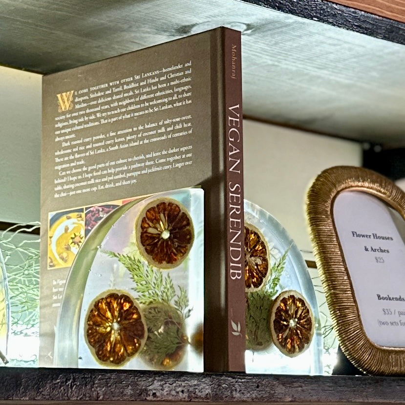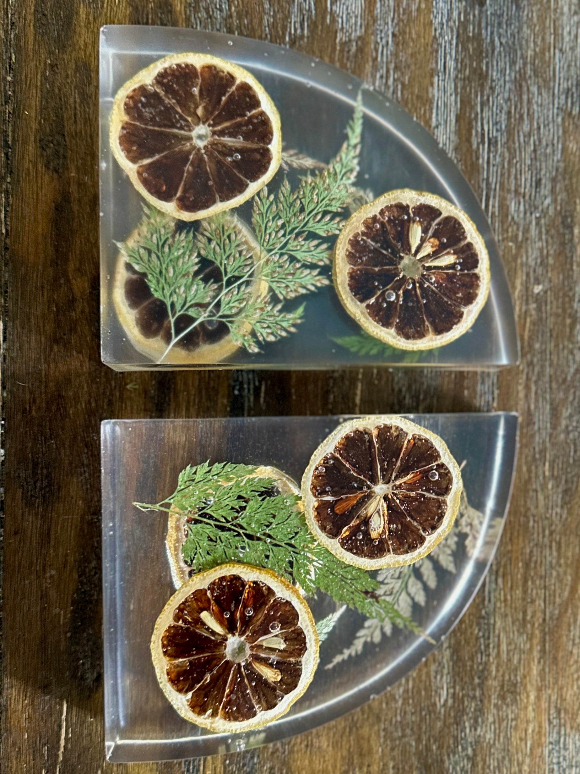 Pair of hand-poured resin bookends made with dried orange slices and green leaves set in clear resin. Smooth on the front, textured on the back. Approximately 4.5" x 5.5" x 1.5" each.