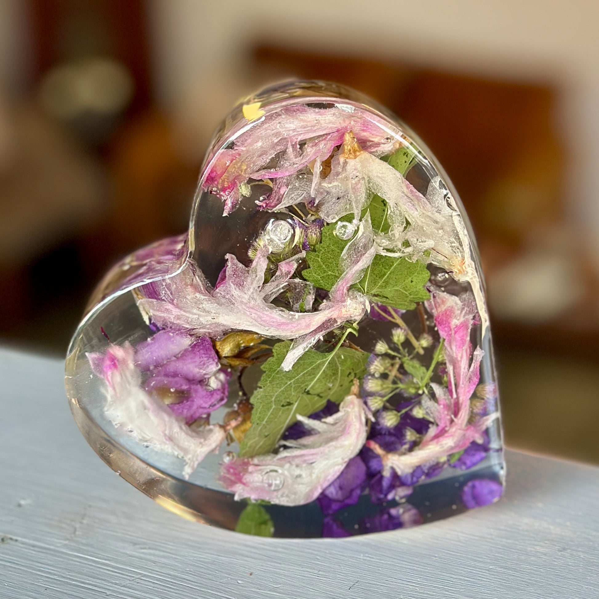 Hand-poured resin heart made with dried pink, purple, and green botanicals, set in clear resin. Approximately 4" wide x 4.5" tall x 1.5" deep.