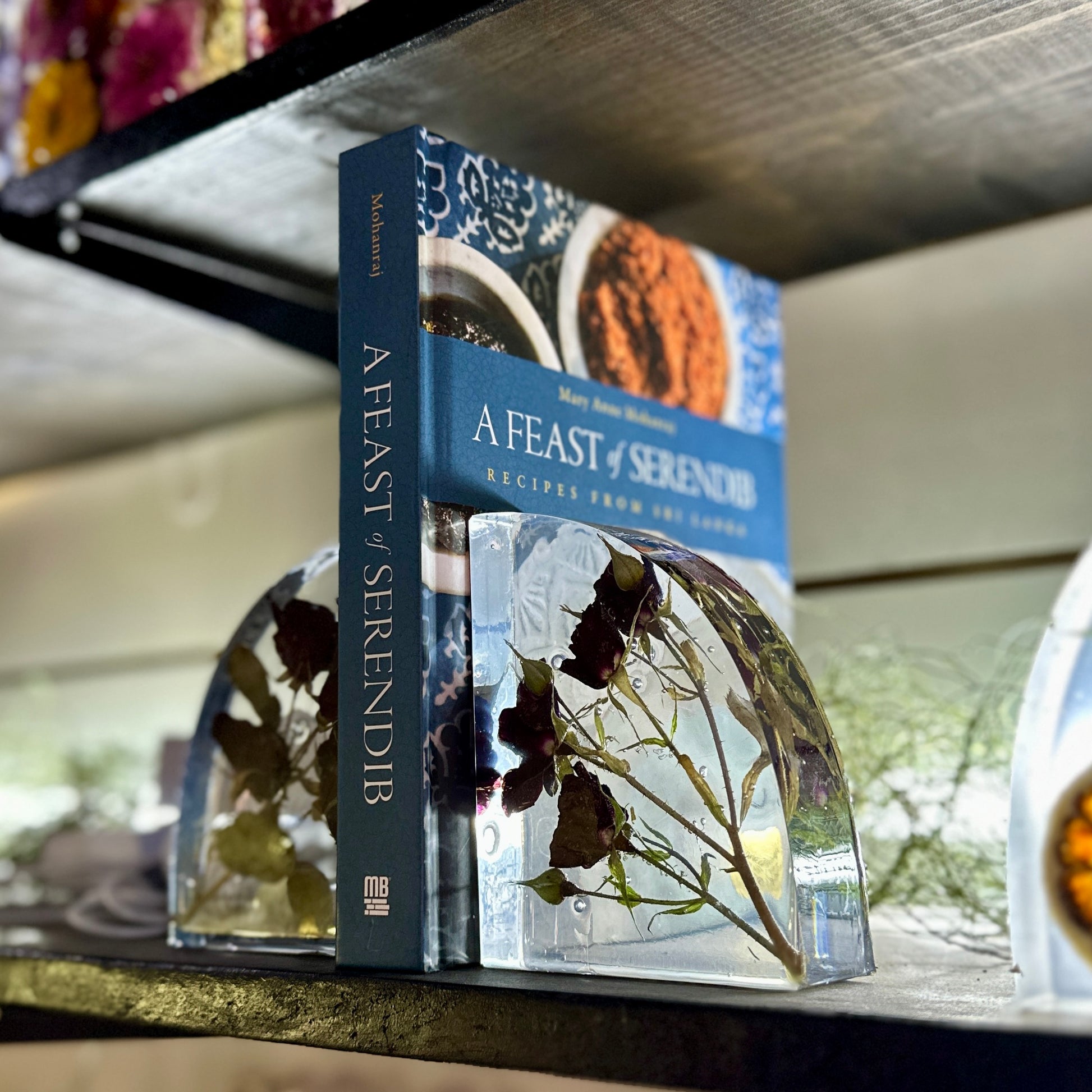 Pair of hand-poured resin bookends made with dried red roses and leaves set in clear resin. Smooth on the front, textured on the back. Approximately 4.5" x 5.5" x 2" each.
