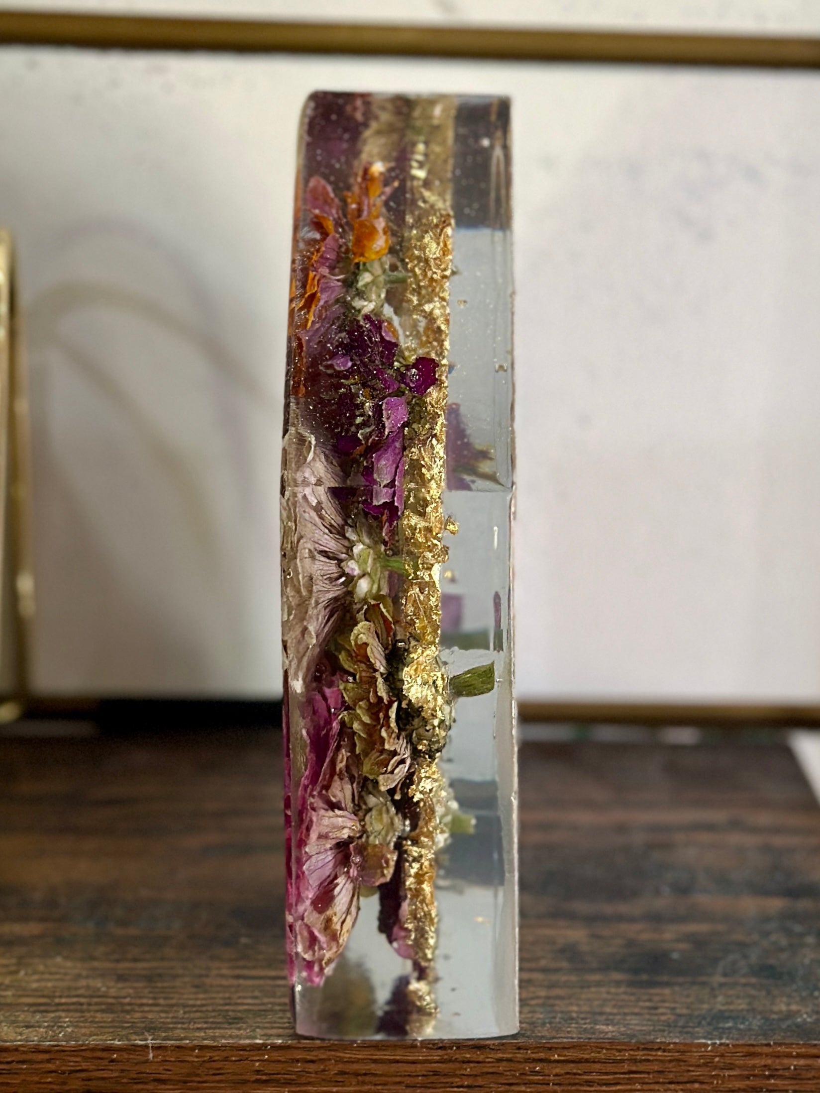 Hand-poured resin house made with pink, orange, and yellow dried zinnia and gold flake set in clear resin. Smooth on the front, textured on the back. Approximately 4.5" wide x 6" tall x 2" deep.